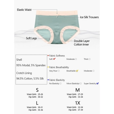 - Shell: 95% Modal 5% Spandex; Crotch Lining: 94.5% Cotton 5.5% Silk