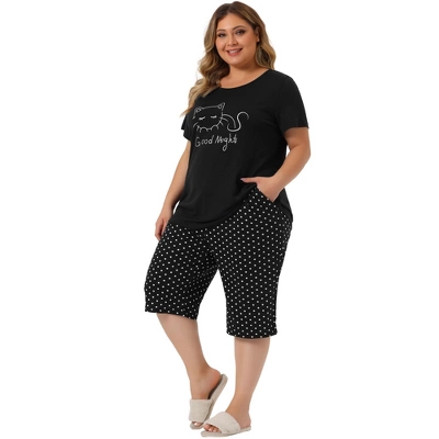 - This loungewear features short sleeves, a round neck, solid color, an elastic waistband, cropped pants, a polka dots pattern design, and a loose-fitting women’s two-piece casual loungewear