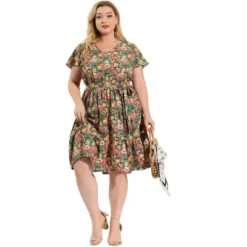 Agnes Orinda Women’s Plus Size V Neck Ruffle Hem 3/4 Sleeve Elegant Floral Dresses