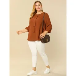 Agnes Orinda Women’s Plus Size Work Pleated Keyhole Back Star Print Puff Sleeve Blouses