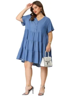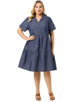 Agnes Orinda Women’s Plus Size Babydoll Outfits Turndown Collar 3/4 Sleeve Chambray Dresses