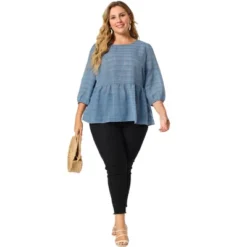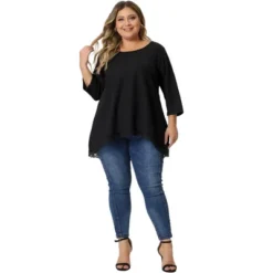 Agnes Orinda Women’s Plus Size Waffle 3/4 Sleeve Lace Panel High Low Hem Round Neck Blouse