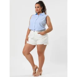 Agnes Orinda Women’s Plus Size Shirts Denim V Neck Drawstring Waist Sleeveless Chambray Tops